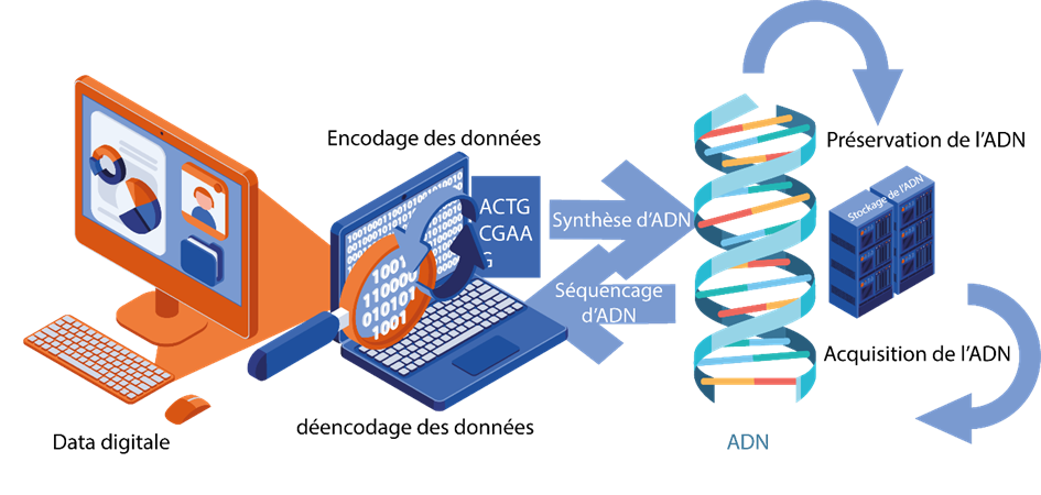 Les données numériques, qu’il s’agisse d’images, de vidéos, de textes ou de fichiers audio, sont d’abord transformées en code binaire, composé de 0 et de 1. Ce code est ensuite converti en une séquence de nucléotides correspondant aux quatre bases de l’ADN : adénine (A), guanine (G), cytosine (C) et thymine (T). Ces séquences sont alors synthétisées chimiquement pour produire des molécules d’ADN capables de conserver l’information. Lorsqu’il est nécessaire de récupérer les données initiales, l’ADN contenant l’information est isolé, séquencé afin de lire l’ordre des bases, puis reconverti en code binaire pour être interprété par un ordinateur.