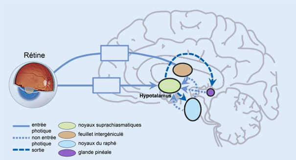 Voies d’entrée et de sortie vers le noyau suprachiasmatique (Source :doi : 10.1007/s11818-019-00215-x)