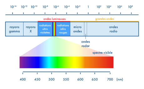 Schéma du spectre du visible (source : https://www.schoolmouv.fr/cours/spectres-d-emission-et-spectres-d-absorption/fiche-de-cours)