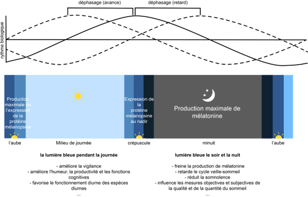 Par conséquent, la variation de l’éclairage ambiant a un impact sur le comportement de repos pendant le sommeil, mais aussi en activité d’éveil et lors de tous les processus biologiques qui en découlent.