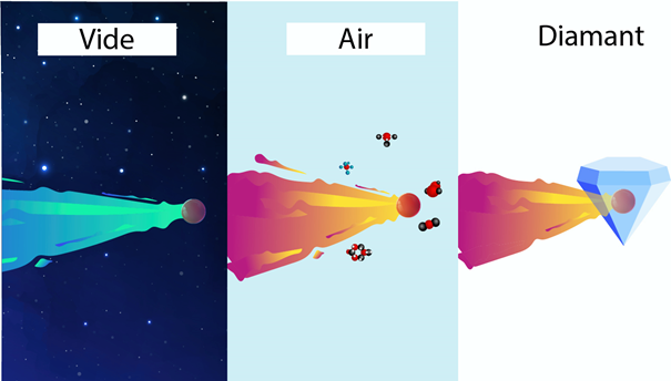 Tous les milieux ne se valent pas. Un diamant est différent de l’eau, de l’air ou même du vide. La lumière ne va donc pas s’y déplacer de la même façon. Sa vitesse est différente.