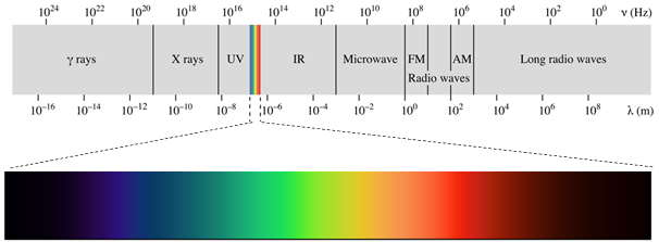 Illustration des plages de longueurs d’onde et de la position de la plage du visible.