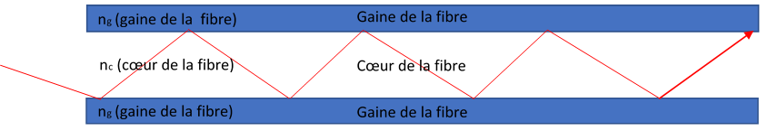 Dans ce cas précis, la composition du tube de la fibre est telle que l’indice du cœur est plus fort que l’indice de la gaine qui l’entoure. Ainsi la lumière rentre avec un certain angle et rebondit à l’interface entre le cœur et la gaine. Les rebonds se reproduisent ainsi jusqu’à l’autre bout de la fibre.
