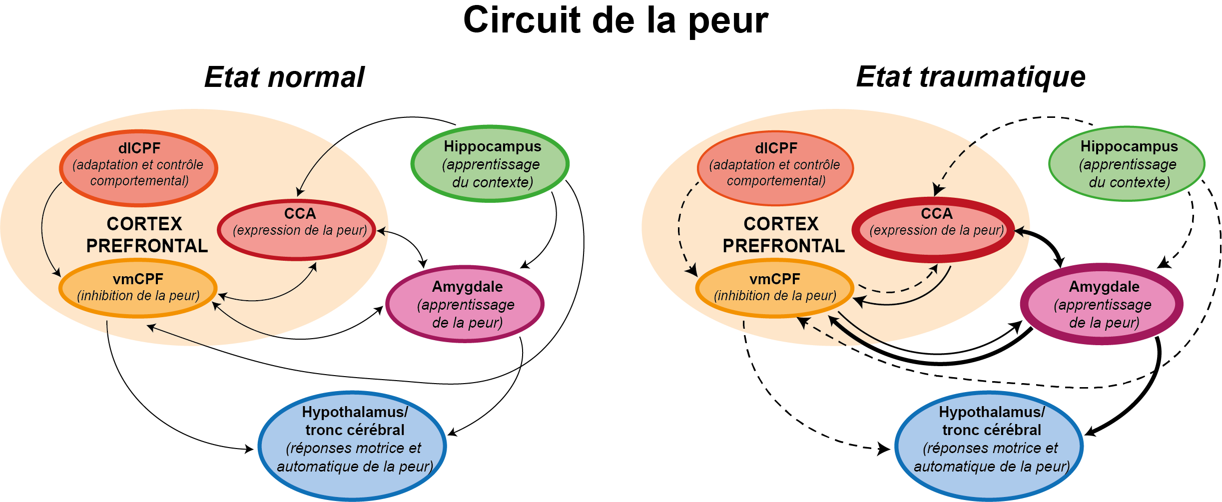 Chez les personnes saines, les régions du cerveau responsables de l’apprentissage de la peur (amygdale, CCA) sont contrôlées par d’autres régions qui permettent de la réguler (dlCPF, vmCPF) et de l’associer à un souvenir précis (hippocampe), ce qui permet une réponse comportementale adaptée à une menace définie (hypothalamus et tronc cérébral). Chez les personnes atteintes du TSPT, la perte de contrôle par le dlCPF et le vmCPF de l’amygdale et du CCA entraîne une hypermnésie de certains éléments du souvenir traumatique. De plus, l’hypoactivation de l’hippocampe induit un déficit de contextualisation, et les éléments entraînant une réponse de peur ne sont plus associés seulement à l’événement traumatique. On parle alors de sur-généralisation de la mémoire, où des faits particuliers ne sont plus associés à un moment et un lieu précis. À cause de ce déséquilibre, l’hypothalamus et le tronc cérébral sont suractivés et induisent des comportements de peur inadaptés et exacerbés. dlCPF = cortex préfrontal dorso-latéral, vmCPF = cortex préfrontal ventro-médian, CCA = cortex cingulaire antérieur.