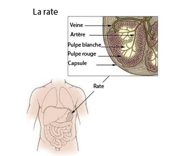 Figure 1 : emplacement de la rate et répartition des pulpes rouge et blanche. La pulpe rouge englobe la pulpe blanche, qui a l'avantage de filtrer mécaniquement le sang dans la pulpe rouge, puis d'activer les cellules immunitaires en cas d'incursion bactérienne ou virale, laissant le sang filtré et propre pour être acheminé vers le cœur. Illustration par Free Wikimedia.