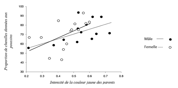 Relation entre la proportion (%) de chenilles données aux poussins et l’intensité de la couleur jaune des parents mésanges bleues ( et al, 2012)