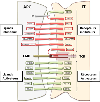 Figure 3 : Les récepteurs activateurs et inhibiteurs des lymphocytes T et les ligands correspondants