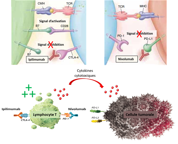 Figure 2 : Représentation schématique de l’action de l’ipilimumab et du nivolumab.