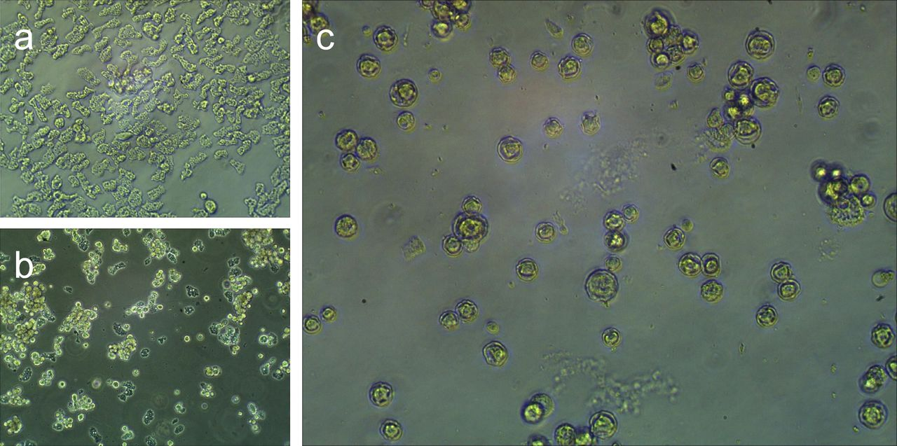 Micrographies en contraste de phase de cellules d'A. castellanii. (a) Cellules de A. castellanii sans infection virale. (b) Cellules de A. castellanii 1 à 2 jours PI. (c) Enchaînement de cellules A. castellanii autour de 2 jours PI. Medusavirus, un nouveau grand virus à ADN découvert dans l'eau de source chaude (G. Yoshikawa et al.)