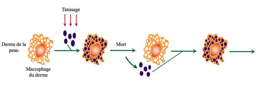 La majorité des pigments va être phagocytée par les macrophages (cellules du système immunitaire) contenus dans le derme. La phagocytose consiste en l’ingestion d’éléments plus ou moins gros par les cellules. Habituellement les macrophages phagocytent les virus ou les bactéries lors d’une infection et les digèrent. Mais dans ce cas précis, les macrophages qui ont mangé les pigments du tatouage vont ensuite rester à leur emplacement initial dans le derme, plutôt que de digérer les pigments.