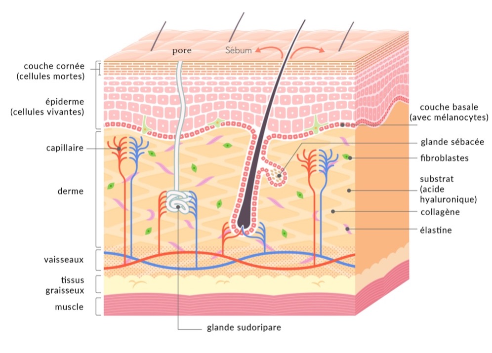 La peau est le plus étendu et lourd des organes du corps humain avec une surface d’environ 2 m2 pour un adulte. Elle a beaucoup de rôles physiologiques, notamment le maintien de la température corporelle, la perception du toucher, l’immunité, la protection de l’environnement extérieur… Elle est composée de différentes couches, un peu comme un oignon, trois au total. En contact avec l’extérieur c’est l’épiderme, cette partie de la peau se renouvelle en quelques semaines. L’épiderme est constitué de sous-couches de cellules qui sont à différents stades de leur vie, du plus profond (la couche basale) jusqu’à la surface (la couche cornée). Au niveau de la couche basale, les cellules sont vivantes et elles constituent un stock. Elles vont se diviser et certaines vont passer dans la couche supérieure (la couche épineuse). Au cours du temps les cellules vont passer d’une couche à une autre en perdant un peu plus de leur fonction à chaque fois jusqu’à atteindre la couche cornée en tant que cellules mortes. C’est un peu comme dans un bol de céréales rempli avec du lait. Votre cuillère va prendre les céréales à la surface du lait (les cellules de la couche cornée vont se détacher avec le contact de l’environnement) et les céréales qui étaient en dessous vont remonter à la surface (les cellules de la couche basale vont migrer vers les couches supérieures).