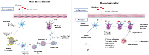 Figure 1: Mécanismes immunitaires liés aux allergies IgE dépendantes. (Adapté de Evrard B., Physiopathologie de l’allergie IgE-dépendante, Revue Francophone des Laboratoires, Volume 2020, Issue 521, 2020, Pages 20-31.)