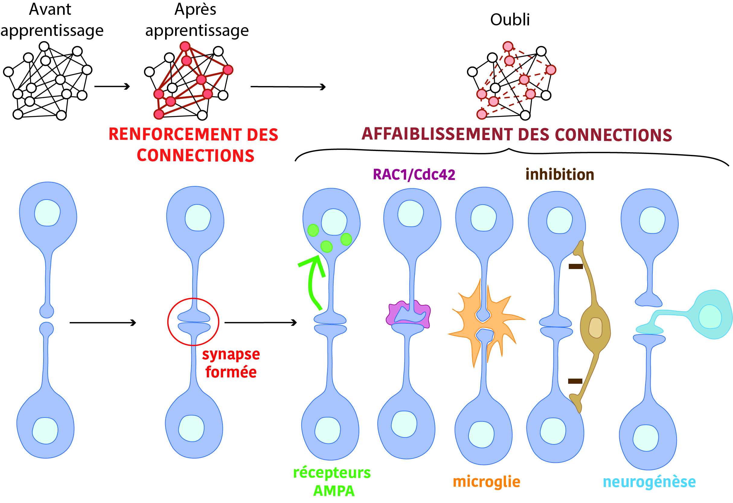 Pour communiquer, les neurones forment des points de contact entre eux, appelés synapses, permettant le passage d’un message d’un neurone à l’autre et ainsi d’activer tout un réseau. Après apprentissage, les synapses d’un réseau sont renforcées, entraînant une communication plus efficace. Chaque neurone ayant la charge de stocker certains détails d’un évènement, la perte ou la déstabilisation des synapses entraînent l’oubli plus ou moins important du souvenir en question.Plusieurs processus biologiques contrôlent ces connexions. À l’échelle moléculaire, après un apprentissage, le nombre de récepteurs AMPA (qui permettent à un neurone de recevoir un signal envoyé par un autre) augmente à la synapse. Des études ont montré qu’après un apprentissage, forcer le maintien de ces récepteurs AMPA à la synapse bloquait l’oubli naturel des évènements observé avec le temps.
