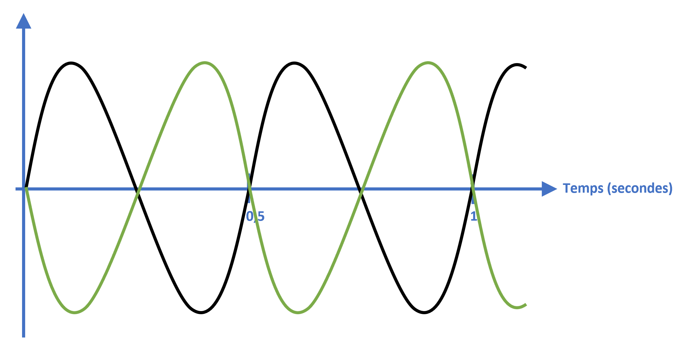 Mécanisme du casque à réduction de bruit active : l’onde sonore parasite (en noir) est annulée par une onde inverse (en vert)