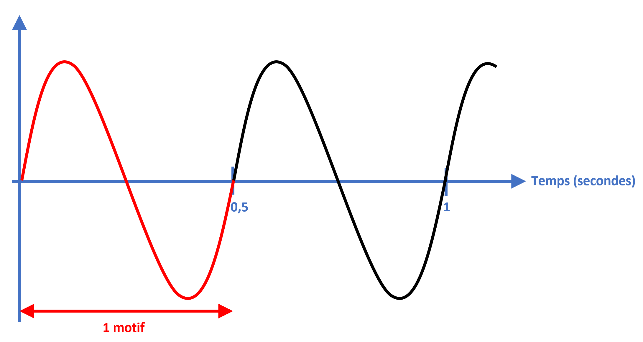 Une note de musique correspond à une onde sonore périodique, c’est-à-dire que l’onde se répète selon le même motif à intervalle régulier. Cet intervalle est appelé la période et se mesure en secondes. Dans la représentation suivante, les crêtes correspondent aux moments où les molécules d’air sont les plus rapprochées (pression), et les creux aux moments où elles sont les plus éloignées (dépression).