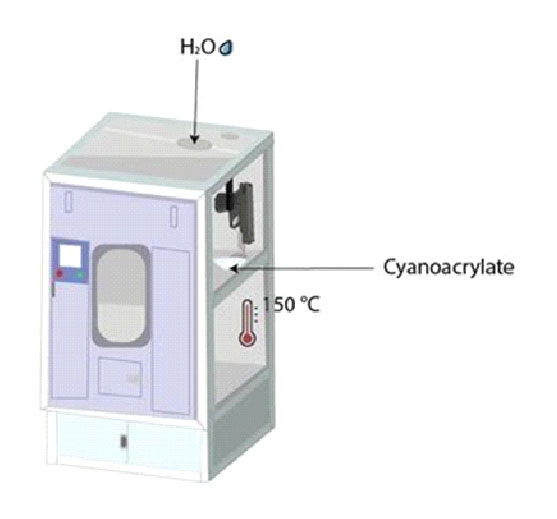 Autre technique très utilisée sur les scènes de crime, le Superglue fuming. Dans une cabine de fumigation, une coupelle dans laquelle sont déposées 2/3 gouttes de cyanoacrylate (la colle) est placée avec des supports semi-poreux ou non poreux (verres, plastiques, métaux et bois vernis)et chauffée à 150 °C avec une humidité de 80 %. Le cyanoacrylate va se fixer sur les composés gras de la trace. Une polymérisation va s’initier (les petites molécules de cyanoacrylate vont se lier les unes aux autres) et donner une empreinte de couleur blanche.