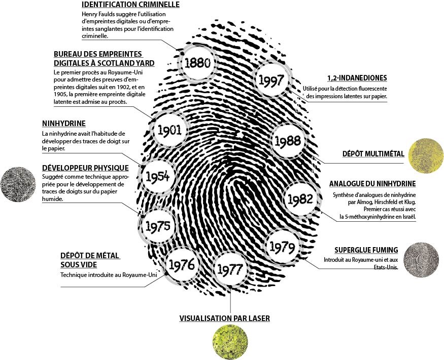 Elles étaient auparavant utilisées pour signer des documents importants. On en retrouve des traces sur des documents datant de l’Egypte ancienne (3000 av. JC). Mais depuis environ 140 ans les empreintes digitales sont utilisées sur les scènes de crime pour identifier les criminels et les appréhender.