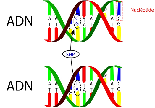 Schéma d’un exemple de SNP. On retrouve une variation de nucléotide