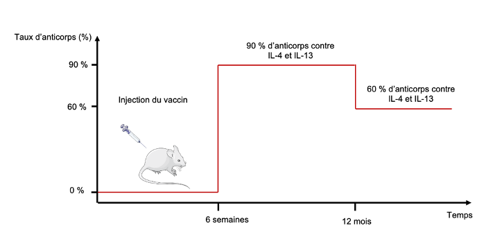 Ce vaccin conjugué a été testé sur des souris. Les résultats ont montré que 6 semaines après la 1re injection, 90 % des souris avaient un fort taux d’anticorps dirigés contre les IL-4 et les IL-13, suffisamment fort pour neutraliser l’activité des interleukines et empêcher la production d’IgE. Après un an, 60 % de ces souris conservent un taux d’anticorps. Les chercheurs ont également pu constater que le vaccin diminuait les symptômes de l’asthme et ne présentait pas d’effets secondaires.