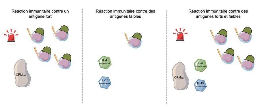 On peut voir cela comme une alarme de voiture. Lorsqu’un voyant s’allume sur la voiture, on l’emmène au garage pour régler le souci. Il n’est pas rare que le garagiste trouve d’autres problèmes à réparer également. Dans notre cas, l’antigène fort est la protéine CRM197, un mutant non toxique (modifiée par les chercheurs) de la toxine diphtérique, c’est notre voyant de voiture qui fait qu’on l’amène au garage. Le système immunitaire va être activé par cette protéine inconnue qu’il pense pathogène. Elle est d’ailleurs utilisée dans de nombreux autres vaccins conjugués. Les antigènes faibles sont les interleukines IL-4 et IL-13 recombinantes. Ces dernières ont des structures très semblables aux IL-4 et IL-13 présentes dans l’organisme mais elles ne peuvent pas induire la production d’IgE. Il s’agit des petits soucis de la voiture dont on n’aurait pas été au courant si on ne l’avait pas emmenée chez le garagiste.