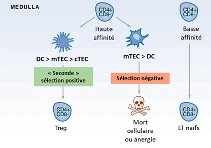 Une certaine proportion des cellules qui ont eu une affinité modérée pour les antigènes du soi va être sélectionnée par les DC majoritairement. Ce sont des thymocytes qui expriment CD4 et CD25 à leur surface, qui deviendront des Treg. Le rôle des Treg sera de contrôler et de stopper les autres lymphocytes. C’est l’équivalent d’une police militaire qui vise à verbaliser les soldats qui sortent du droit chemin. Les Treg eux aussi pourront alors sortir du thymus et exercer la tolérance périphérique pour éviter par exemple la survenue de maladies auto-immunes.