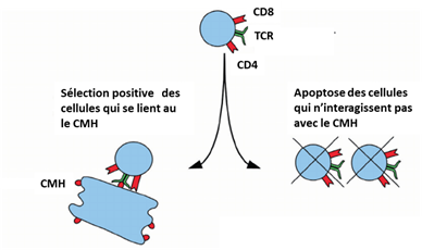 L’éducation de nos lymphocytes T est rude et impitoyable, et l’échec se traduit par l’apoptose, c’est-à-dire la mort de la cellule. Pour les fans de jeux vidéo rétros, la cellule va en quelque sorte subir un fatality si elle ne passe pas les tests. Lors de la sélection positive, les thymocytes sont au stade DP double positif car ils expriment à la fois le CD4 et le CD8, et ils sont localisés toujours dans la zone corticale, appelée aussi cortex. L’enjeu de la sélection positive est que le thymocyte soit capable de reconnaître et soit restreint à notre propre CMH. On veut conserver les thymocytes dont le TCR a le plus d’affinité envers le CMH du soi, d’où une sélection dite « positive ». Les cTEC qui sont présents dans le cortex vont présenter leur CMH aux thymocytes pour que la sélection se fasse. Si un thymocyte reconnaît le CMH, un mécanisme de sauvetage se met en place. Tandis que les autres thymocytes, qui ont une faible ou pas d’interaction avec le CMH, entrent dans un programme de mort cellulaire. C’est également à cette étape que les thymocytes vont exprimer de manière irréversible soit le CD8 au contact du CMH de classe I, soit le CD4 au contact du CMH de classe II.