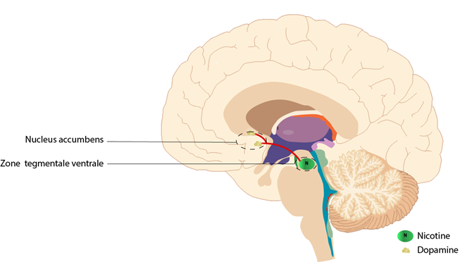 Schéma de l’interaction nicotine/dopamine dans le cerveau